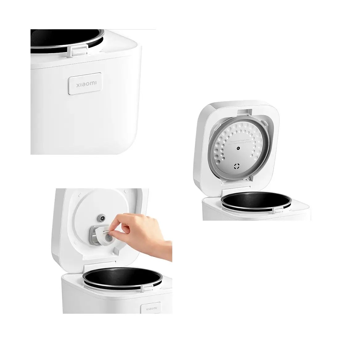 The rice cooker includes a one-press lid opening to reduce exposure to steam, a detachable inner lid for rinsing, and a removable steam valve for thorough cleaning.